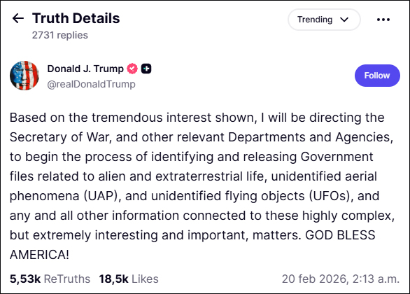 LAATST TOEGEVOEGDE ARTIKELEN 20 februari 2026 - Lara Trump, schoondochter van president Donald Trump Lara Trump: President Trump heeft een toespraak gepland over buitenaards leven. Ze haalt zelfs een opmerking van hem aan toen ze hem er naar vroeg: "Ik bekijk dingen vanuit de onmetelijkheid van ons universum." Juist, het is Godsonmogelijk dat alleen ons planeetje in dat niet te meten, nagenoeg oneindige universum, met daarin triljoenen en triljoenen sterren en planeten, over intelligent leven beschikt. Donald Trump begrijpt dat. 20 februari 2026 - Bericht van de Amerikaanse president Donald J. Trump