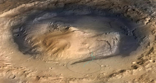 Luchtfoto van NASA ruimtevaartuig van de Gale krater op mars. In de cirkel ligt het landingsgebied van de Curiosity rover