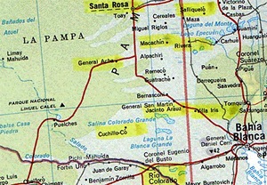 van Argentinië, ten noordwesten van Bahia Blanca. In de geel gemerkte